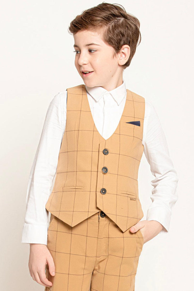 Let your kid make a fine statement with this smart piece of beige waistcoat ideal for day functions. This waistcoat will contrast perfectly with white or navy shirt. This casual look waistcoat textured all over, will give your kid a stylish look.