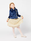 A golden tutu skirt is every girl’s best friend. It can be dressed down with a white turtleneck sweater or with a satin white blouse for a formal look. It is a wardrobe essential. Pair it with a golden headband and white stockings for an elegant look.
