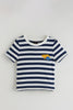 This printed half-sleeve t-shirt is stylish and fun. It features character embroidery on the front and striped fabric that adds to the flair. Ideal for casual outings or more active days.