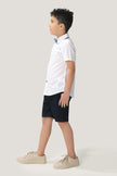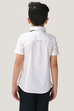 This half sleeve White Shirt for boys is accented with a blue bow and detailed with blue fabric tape design on the chest pocket and sides. Crafted from soft, breathable 100% Cotton fabric, it ensures comfort for your little one while adding stylish and cool touches to their outfit. Perfect for casual and semi-casual look.