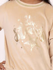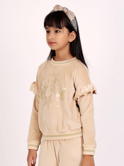 If you want your daughter to look classy and sophisticated, dress her in colors and fabrics that are luxurious and subtle. This beige woolen top with a Victorian style neck is super elegant and will get your daughter many compliments. Pair it with matching pants for a refined look.