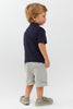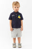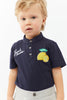 This navy blue T-shirt has a collar and buttons that make it look casual but smart. Its got a lemon patch and graphic that add to its charm.