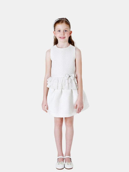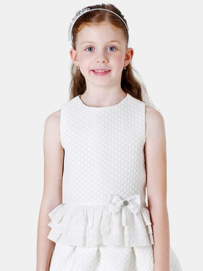 This top is perfect for a modern day. This Warm white color with premium fabric, it has a gorgeous warm white color, adorned with lining. It also features a big three bow flower on its top front and pleats fall down from its waist down. The highlight self-design pattern of this dress that give it a unique look.