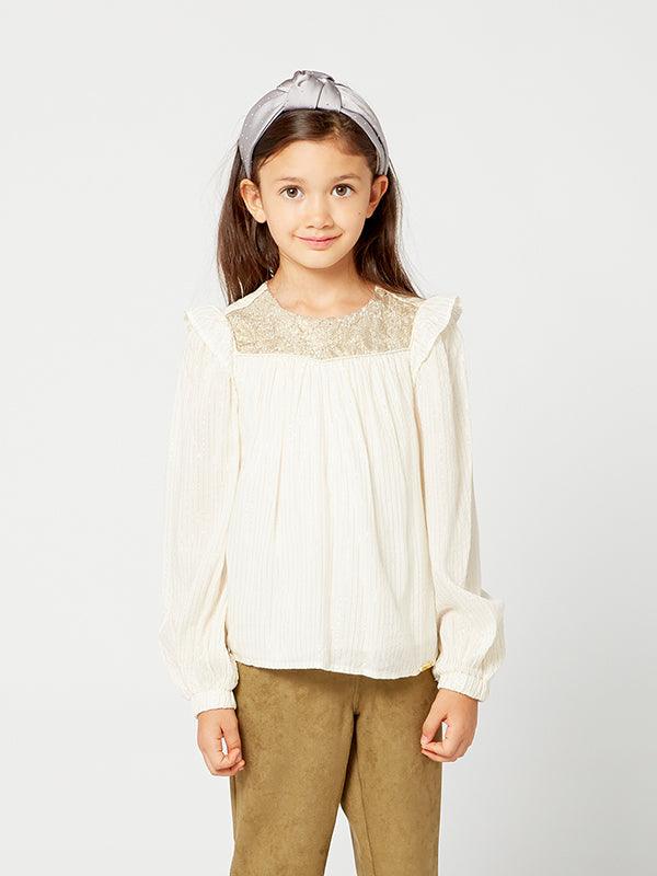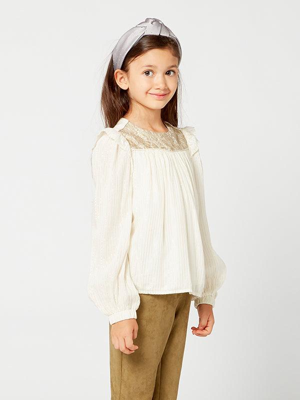 A formal white top is a must have clothing item in your daughter’s closet. This one has a rich pleated fabric with a golden lace pattern on the front, which makes it party perfect. It is super versatile and can be teamed with everything.