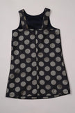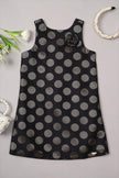 Introducing the One Friday Girls Navy Blue Polka Dot Dress - a fusion of ethnic and western look dress with a round neck and sleeveless design. The back features a convenient zipped-down opening, while one shoulder is accented with a matching flower. Chic and versatile, perfect for any occasion.