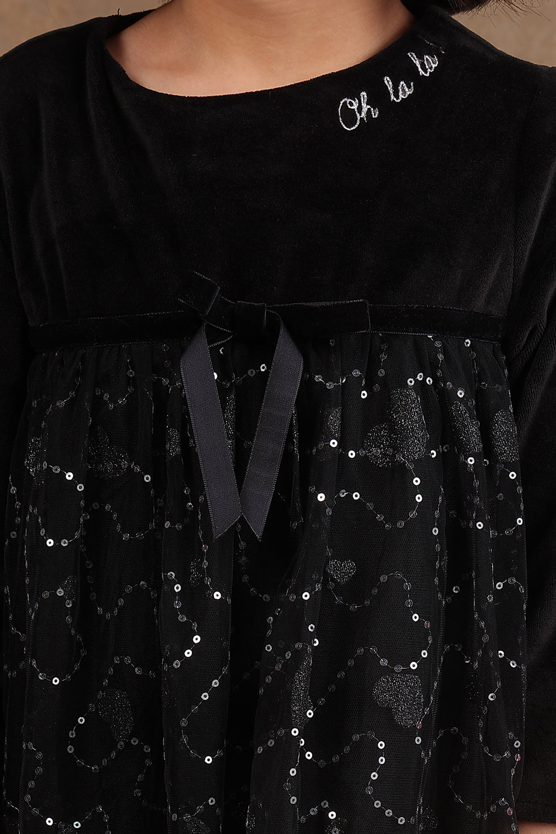 This One Friday Kids Black Sequinned Net Party Dress is the perfect choice for a special occasion. Made with high-quality polyester fabric, the dress features a velvet-covered chest and sleeves, adorned with shimmering hearts design on the sequinned net. The intricate Oh La La embroidery on the neckline adds a touch of sophistication. With a closed round neck and buttoned closure, this dress offers both style and comfort with its 100% cotton inner lining. Your little one will shine in this below-knee length dress!