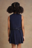 This One Friday winter dress for girls is the perfect addition to any winter wardrobe. The classic navy blue color is accented with shimmered taping and designer buttons, adding a touch of elegance. The pleats on the bottom circumference give the dress a stylish flair, while the zippered back opening and sleeveless design make it perfect for any winter occasion. Stay warm and stylish with One Friday!