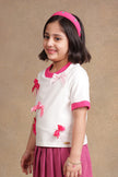 Dress your little girl in style with the One Friday Kids Girls Pink bow White Top. Made from soft cotton, this top features a round neck and elasticated rib corners for a comfortable fit. The cute vibrant pink bows add a playful touch to this classic white top. Perfect for any occasion.